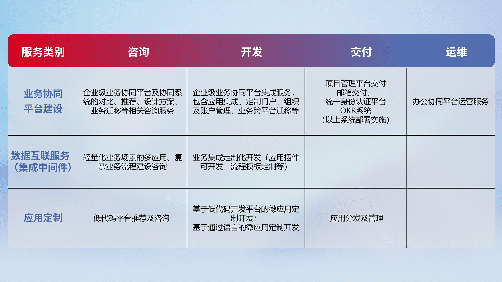 针对钉钉、、、企微、、IDaas等平台级产品提供产品的规划、、、、方案、、交付、、定制化开发等服务,,,,实现如统一协同办公、、、智能客户服务、、混合会议管理、、、智能数据查询、、等业务场景,,实现数字化转型。。。